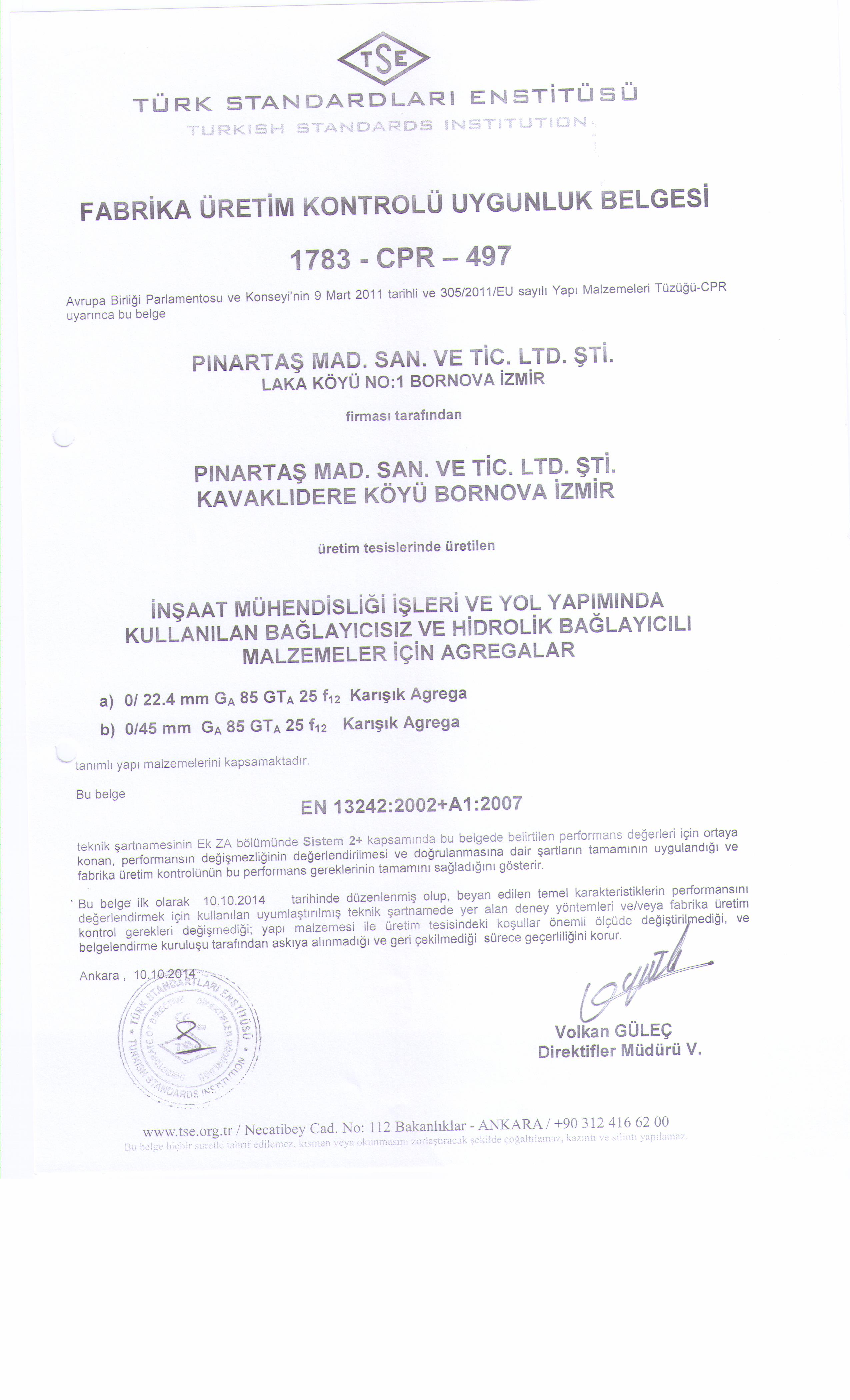 Tesislerimizde üretilen ürünler, TSE stadartları dahilinde üretilmektedir. Üretimimizin her aşamasında kalite en önemli unsur olarak ele alınmaktadır. Düzenli laboratuvar kontrolleri ile kalitenin devamlılığı sağlanmaktadır.